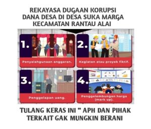 Kabar yang kurang sedap dari desa suka marga kecamatan rantau alai diduga kepala desa melakukan korupsi dana desa dan anggaran dana desa dari tahun 2023-2024.