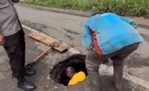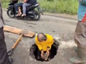 Hujan deras yang mengguyur sejak dini hari memperburuk kondisi gorong-gorong. Struktur yang sudah rapuh itu kini ambrol, meninggalkan lubang besar yang menganga di badan jalan,