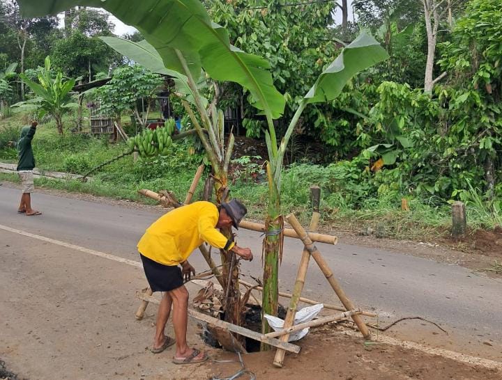 “Kami resah. Jalan makin parah, macet, dan rawan kecelakaan,” kata seorang warga yang bersama-sama penduduk lain memasang tanda peringatan bahaya di lokasi jalan amblas, Jumat (3/10).