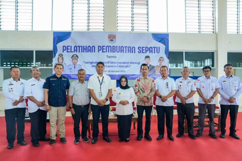 Bupati Mesuji Hj. Elfianah, SE secara resmi membuka Pelatihan Pembuatan Sepatu yang diselenggarakan oleh Dinas Tenaga Kerja dan Transmigrasi Kabupaten Mesuji, Rabu (22/10/2025). Kegiatan tersebut berlangsung di Gedung Serba Guna (GSG) Taman Kehati, Desa Mekar Sari, Kecamatan Tanjung Raya, Kabupaten Mesuji, dan dijadwalkan berlangsung selama tujuh hari, mulai 22 hingga 28 Oktober 2025.