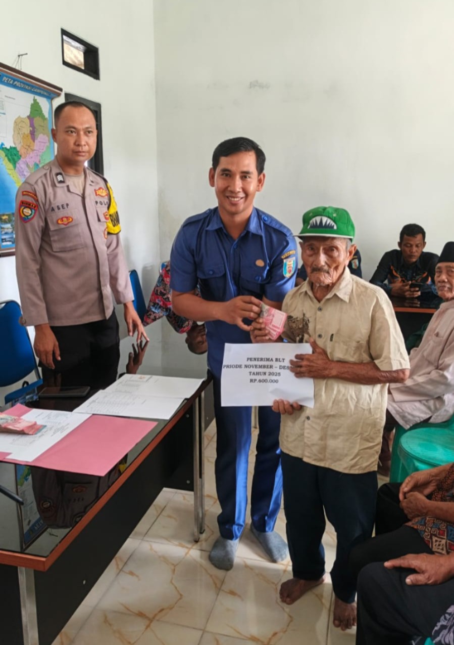 Bhabinkamtibmas Polsek Negeri Besar Polres Way Kanan, Brigadir Polisi Asep Syahrudin, mengawal penyaluran dana BLT DD (Bantuan Langsung Tunai Bersumber Dana Desa) di Aula Balai Kampung Kaliawi Indah Kecamatan Negeri Besar Kabupaten Way Kanan. Rabu (12/11/2025).