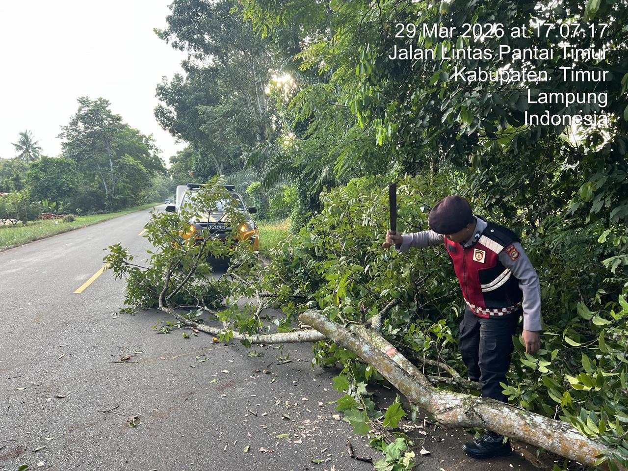 Respon cepat ditunjukkan oleh Personel Unit Patroli Sat Samapta Polres Lampung Timur dalam menangani dampak hujan lebat yang terjadi pada hari Minggu (29/3/26) sekitar pukul 17.00 WIB. Hujan dengan intensitas tinggi tersebut menyebabkan sebuah pohon tumbang dan menutup akses jalan di Jl. Raya Lintas Timur, Kecamatan Sukadana, Kabupaten Lampung Timur.